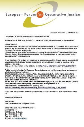W porozumieniu z Panią Beatą Czarnecką- Dzialuk- członkiem Zarządu Europejskiego Forum na rzecz Sprawiedliwości Naprawczej zamieszczamy list otwarty, skierowany do wszystkich osób, które chciałyby udzielić poparcia dla działań na rzecz pomocy osobom pokrzywdzonym przestępstwem i ofiarom przemocy, w państwach członkowskich Unii Europejskiej.