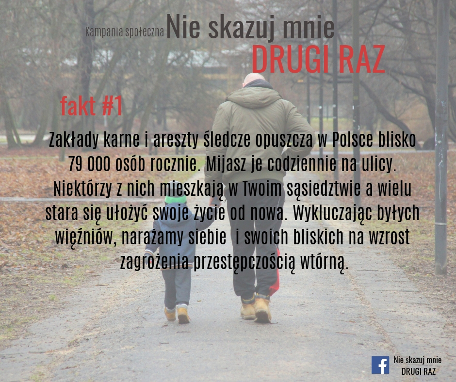 Kampania społeczna „Nie skazuj mnie DRUGI RAZ” (o której piszemy tutaj) ma na celu propagowanie wiedzy na temat funkcjonowania w społeczeństwie osób opuszczających jednostki penitencjarne oraz zachęcanie do rezygnacji z powszechnie obecnych stereotypów i uprzedzeń wobec tej grupy osób. Pomysłodawczyni tego projektu- Anna Tulej wraz ze współorganizatorem, którym jest Stowarzyszenie Sursum Corda w Nowym Sączu zamierzają cyklicznie dzielić się merytorycznymi faktami dotyczącymi zagadnienia readaptacji społecznej osób opuszczających zakłady karne. Dzisiaj publikujemy Fakt #1.