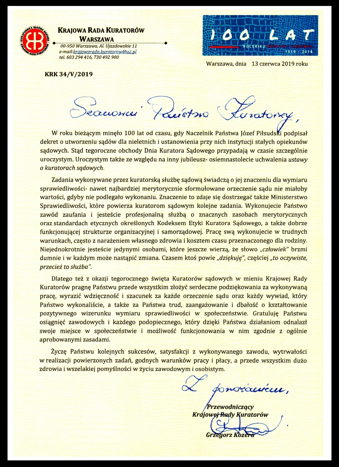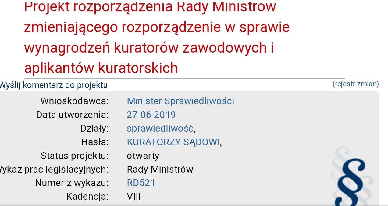 W dniu 27 czerwca 2019 r.na stronie Rządowego Centrum Legislacji opublikowano Projekt rozporządzenia Rady Ministrów zmieniającego rozporządzenie w sprawie wynagrodzeń kuratorów zawodowych i aplikantów kuratorskich, który zakłada wzrost mnożników kwoty bazowej: