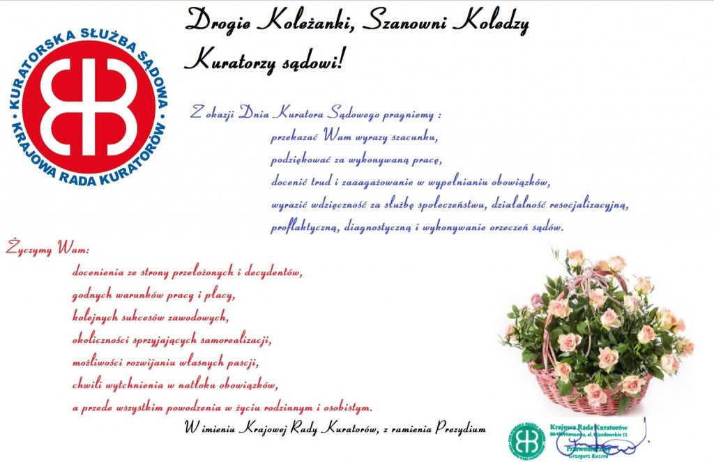 Dziś obchodzimy Nasze Święto – Dzień Kuratora Sądowego. Jest to okazja do wzajemnych życzeń niesłabnącego entuzjazmu, satysfakcji z wykonywanej pracy – ale i podziękowań – za profesjonalne zaangażowanie w służbie drugiemu człowiekowi. Choć kolejne stulecie kurateli sądowej już od początku stawia przed nami zupełnie niespodziewane wyzwania – pamiętajmy, że działając wspólnie, osiągniemy ważne dla nas cele. I tego życzymy wszystkim kuratorom sądowym w Dniu Naszego Święta.