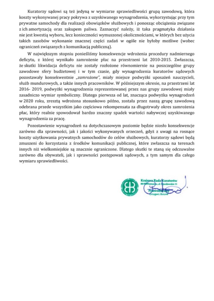 Krajowa Rada Kuratorów podjęła uchwałę, w której podtrzymuje stanowisko przedstawione również podczas udziału w posiedzeniu Komisji Budżetowej Krajowej Rady Sądownictwa. Uchwała wyraża wsparcie dla postulatów płacowych podnoszonych przez centrale związkowe.