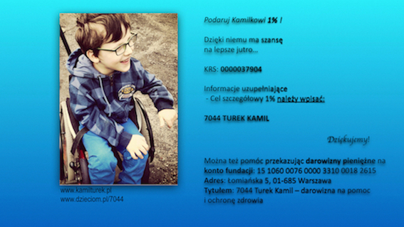 Mam serdeczną prośbę, jeżeli jeszcze się nie rozliczyliście, nie macie na kogo przekazać swojego 1%, proszę nie oddawajcie go skarbowi państwa. Możecie przekazać 1% n rzecz Kamilka Turka syna kuratora zawodowego z ZKSS w Radomiu