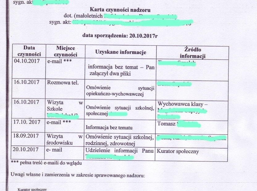 3. Przebieg nadzoru i podejmowane na bieżąco czynności kurator rodzinny dokumentuje w karcie czynności nadzoru, prowadzonej osobno dla każdego podopiecznego, w której wpisuje datę, miejsce i rodzaj czynności, uzyskane dokumenty i informacje oraz ich źródła, a także własne uwagi i zamierzenia w zakresie sprawowania nadzoru.